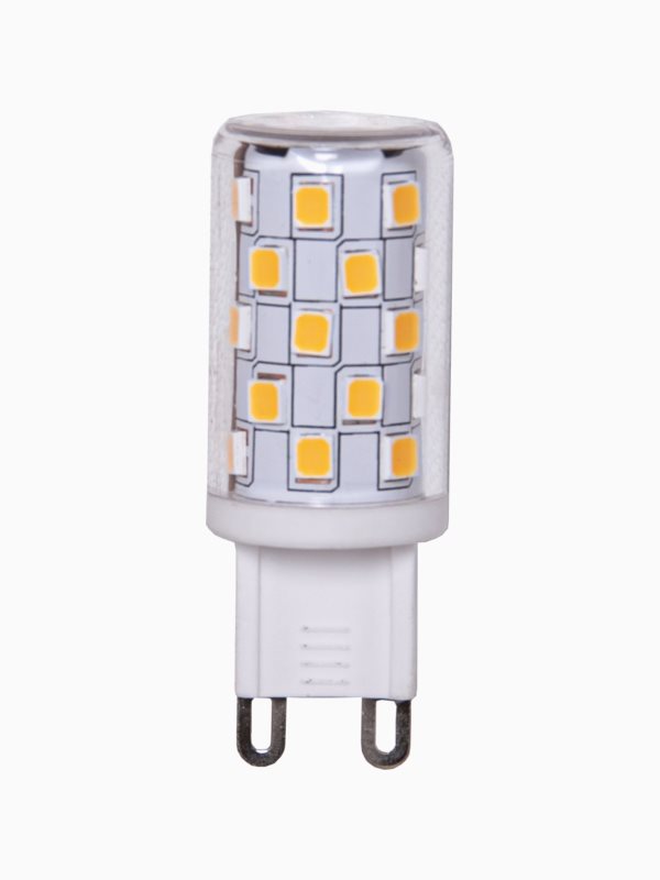 En ledpære, stift, med G9-kontakt som gir et varmt lys og som er dimbar