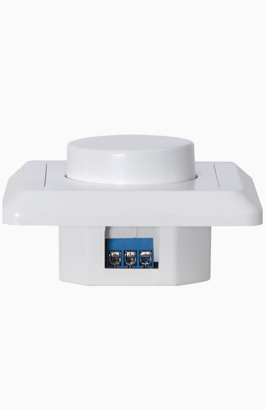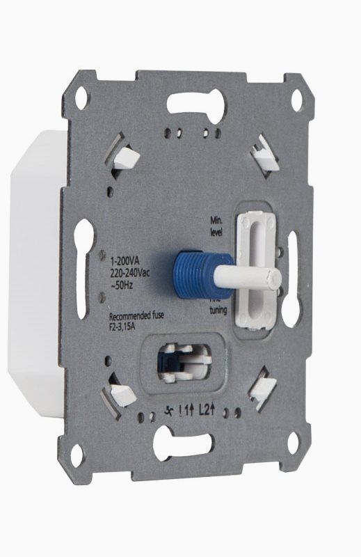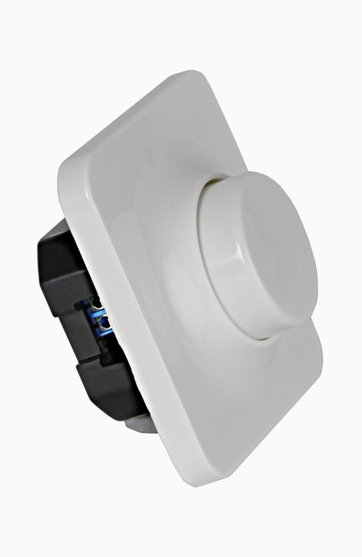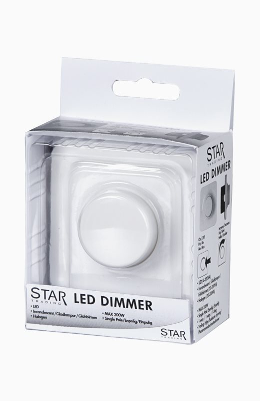 Veggdimmer 0-200VA fra Star Trading, kan dimme LED, glødepærer og halogenpærer 230V. Kompatibel med de fleste av Star Tradings dimbare LED-pærer. Vri for å dimme, trykk for å slå på / av. IP20 for innendørs bruk.» Se dimmerliste her for kompabilitet med Star Tradings lyskilder