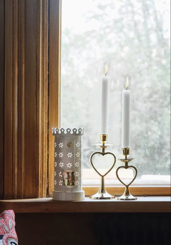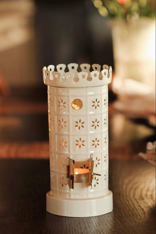 Vakker hvit telysholder i metall, inspirert av en klassisk kakelovn i miniatyr. Den kremhvite overflaten og de perforerte detaljene gjør at telysets lys sprer seg varmt og dekorativt. Passer standard telysstørrelse.